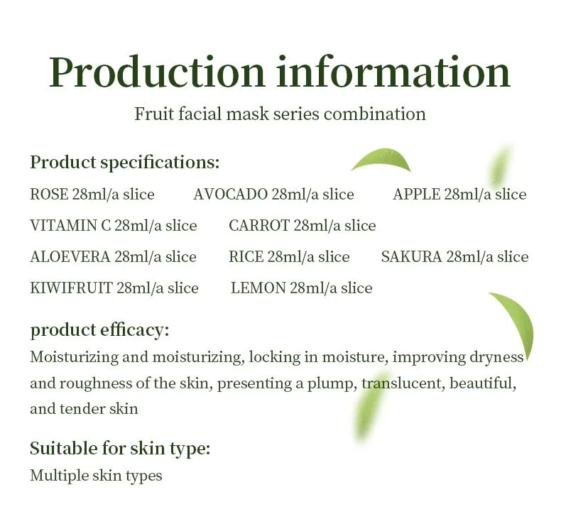 Diese Maske mit Fruchtgeschmack ist speziell für feuchtigkeitsspendende, feuchtigkeitsspendende und feuchtigkeitsspendende, kombiniert eine Vielzahl von natürlichen pflanzlichen Essenzen und Protein Zutaten, sanft und effektiv hellt den Hautton, und ist für alle Arten von Haut geeignet.